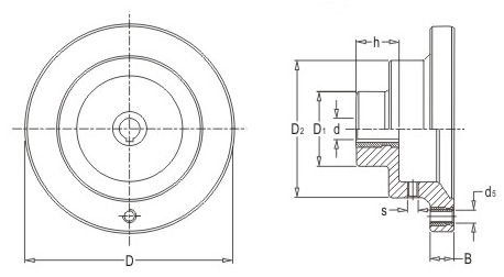 JS.105005 滿輻表盤手輪 顏色:黑色 材質(zhì):酚醛樹脂(膠木)、鋁合金 用途:適用于木工、食品、包裝、印刷等機(jī)械的精密指示或讀數(shù)調(diào)節(jié) 特性:外形美觀、堅(jiān)固耐用、機(jī)械式結(jié)構(gòu)、